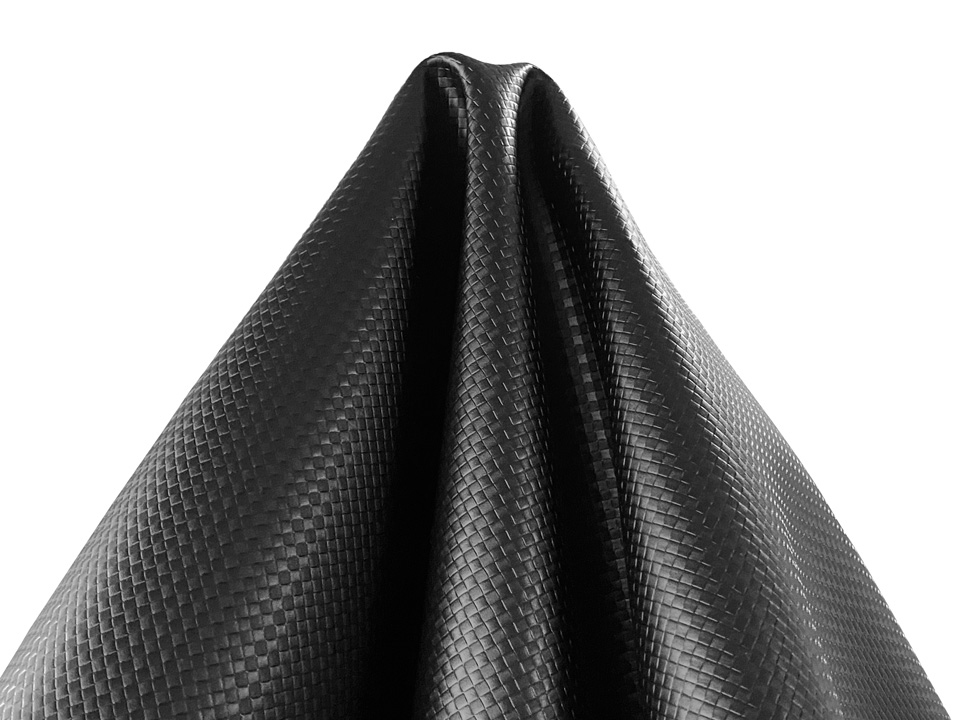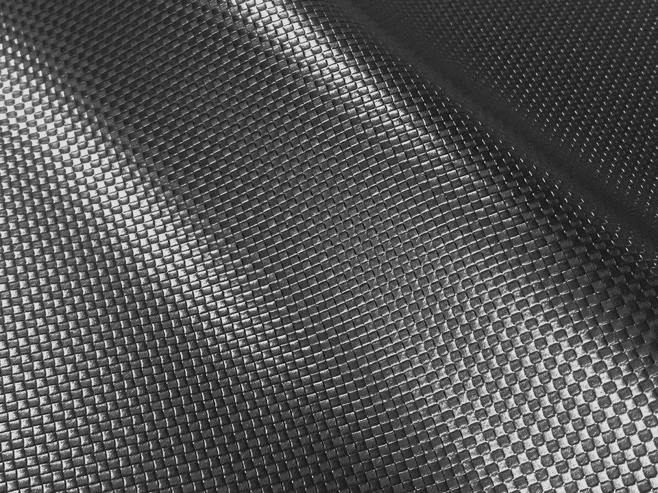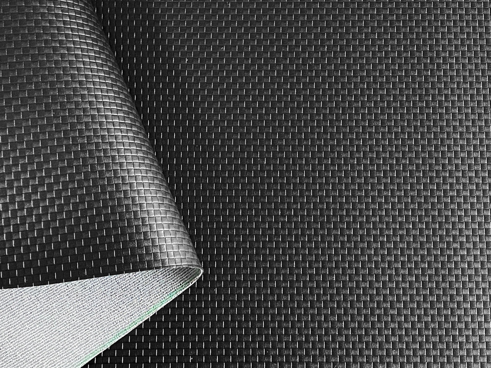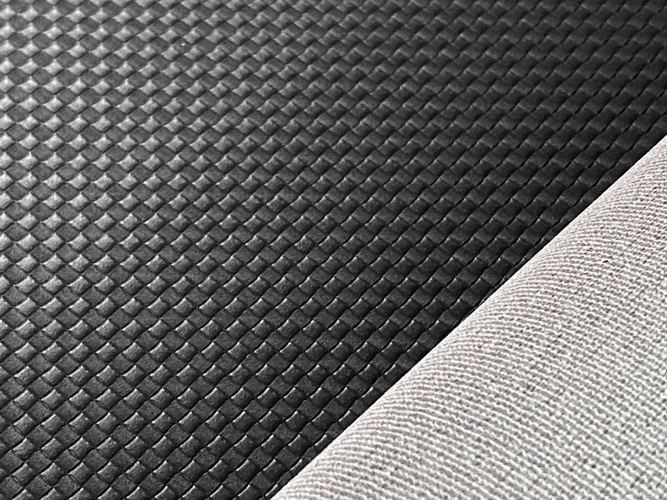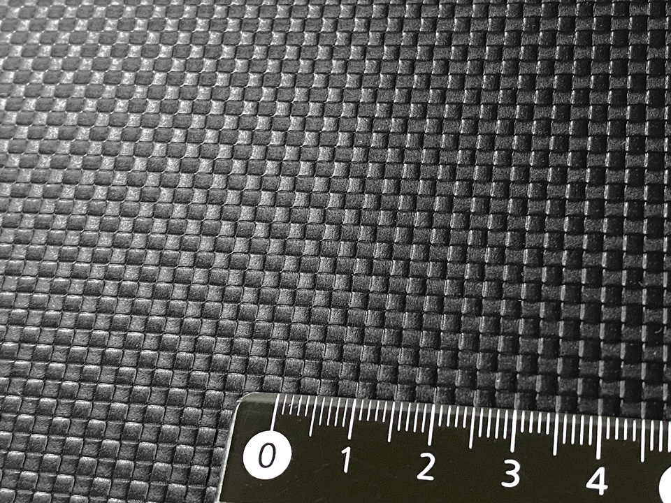 細かいスクエアメッシュ模様のエンボス(凹凸)が施された滑りにくく丈夫な生地です。伸縮性があるので施工がしやすく、お車の内装にお使いいただける難燃性です。